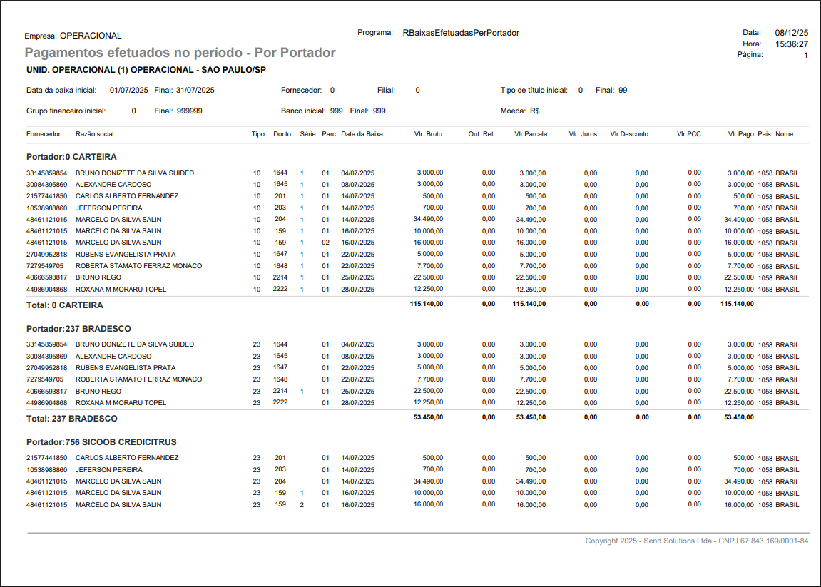 Cenário 2: Gerar relatório Pago por Portador