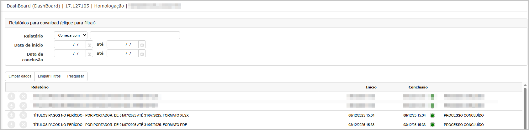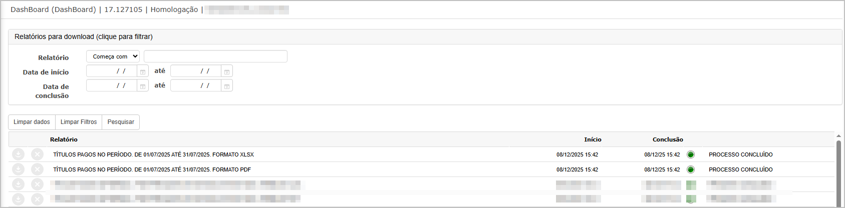 O sistema irá direcionar para dashboard, onde é possível baixar os relatórios gerados.