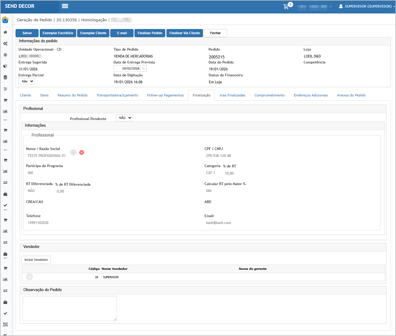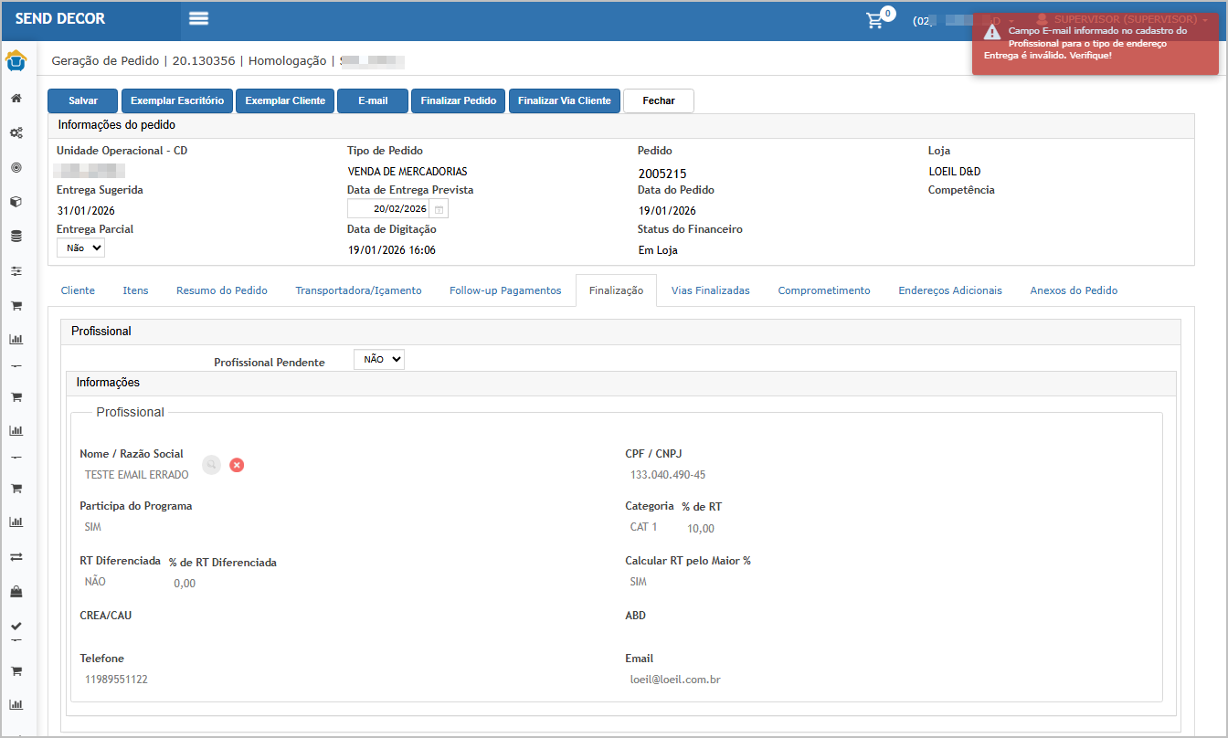Cenário 04: Finalização do Pedido (Pedido normal): bloquear finalização por dados inválidos do Cliente/Profissional