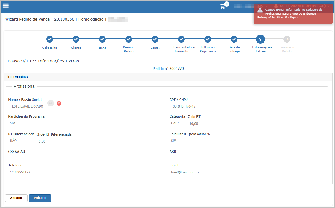 Cenário 05: Finalização do Pedido (Pedido passo a passo): bloquear finalização por dados inválidos do Cliente/Profissional