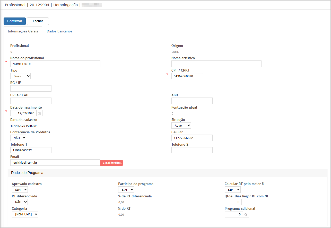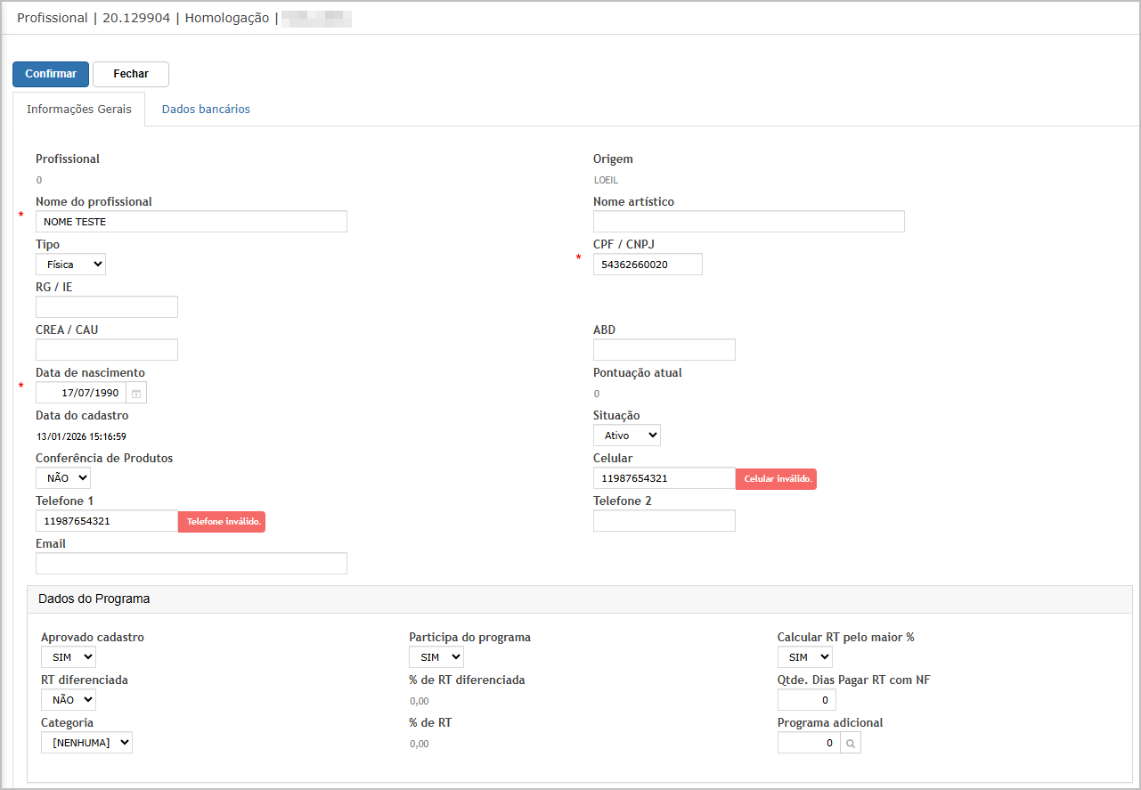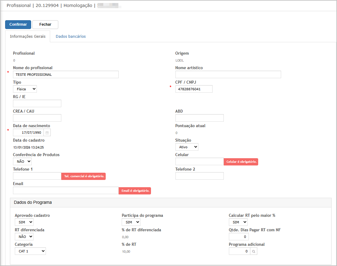 Cenário 02: Profissional: Validação de Obrigatoriedade e Dados Validos.
