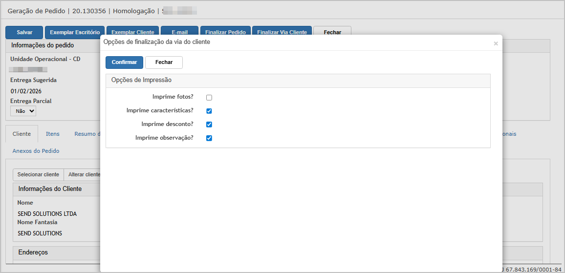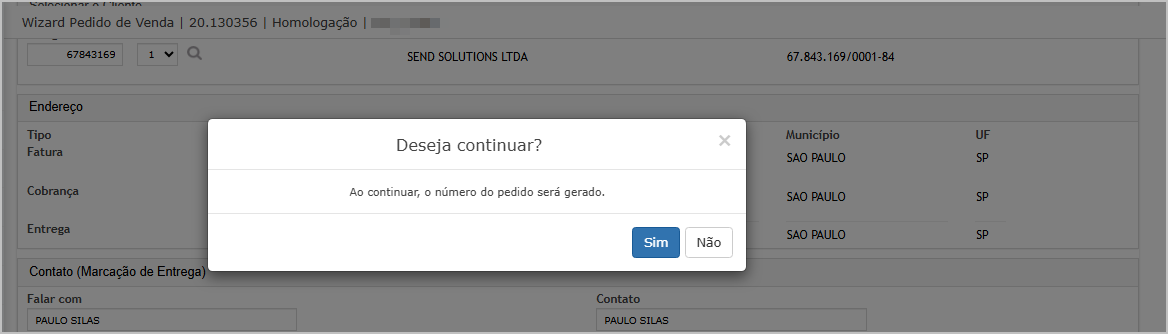 Após ajustar os dados e clicar em próximo, o sistema exibe pop-up para confirmar a geração do pedido.