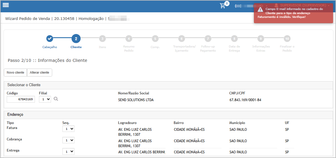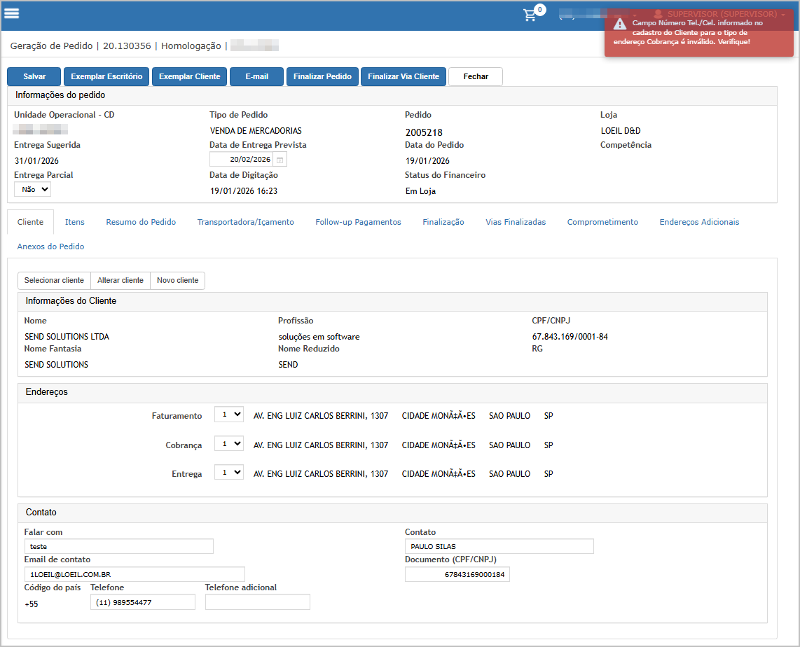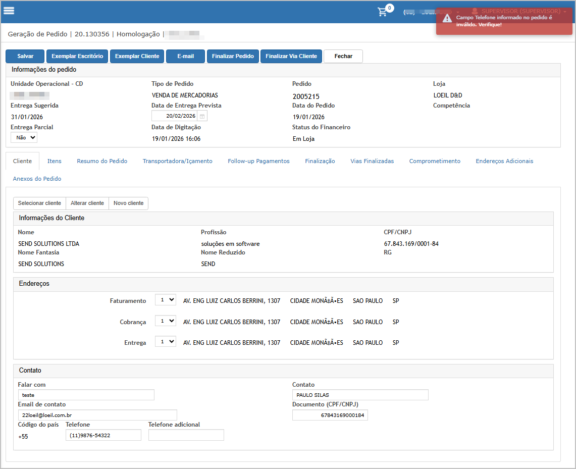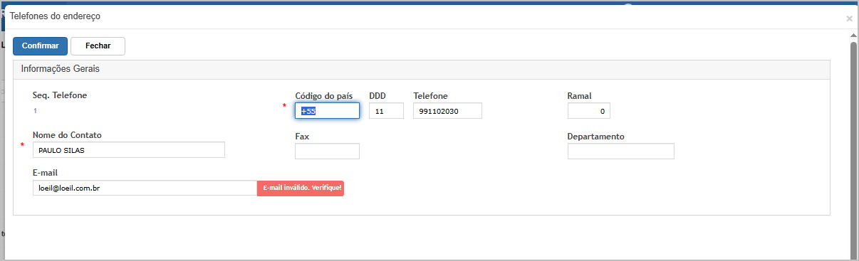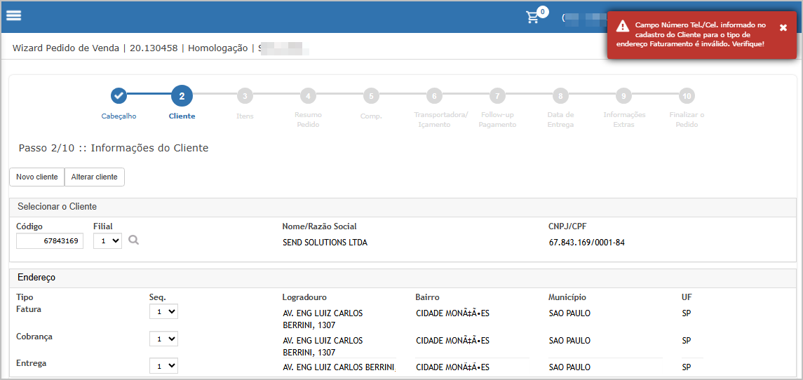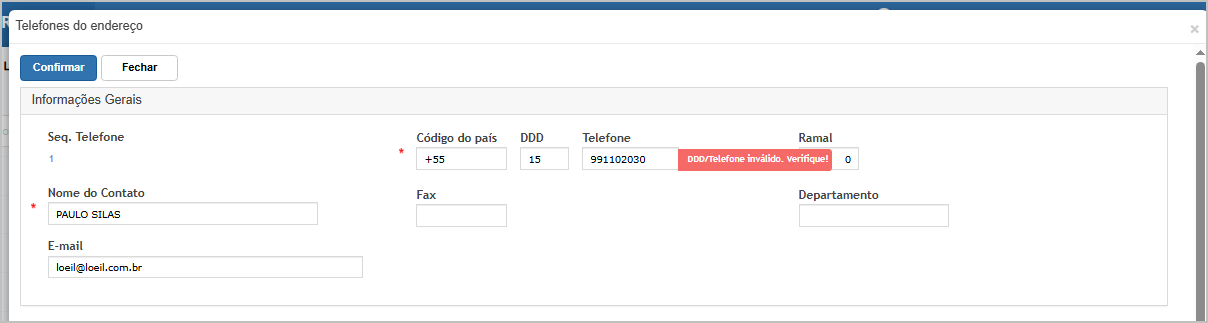 O sistema irá indicar em qual tipo de endereço o telefone está invalido.