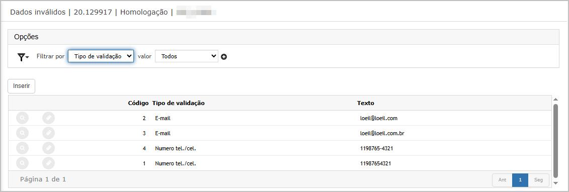 Incluir um registro do tipo E-mail inválido com o valor