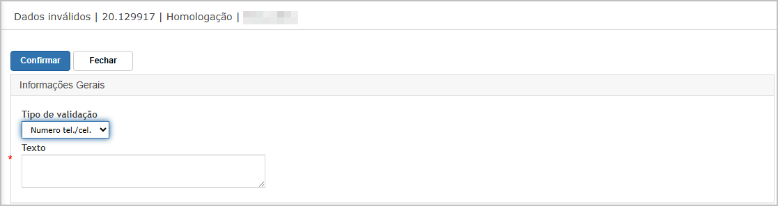 Ao abrir a tela de cadastro, selecione o tipo de validação e informe o texto que será validado. Após isso clique em Confirmar.