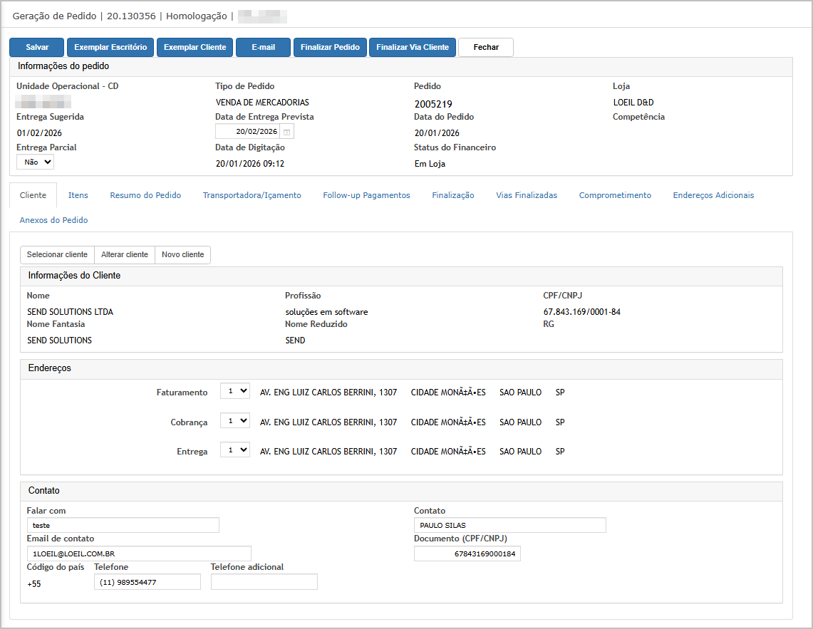 Neste momento serão validados o e-mail/Telefone do cliente e do pedido.