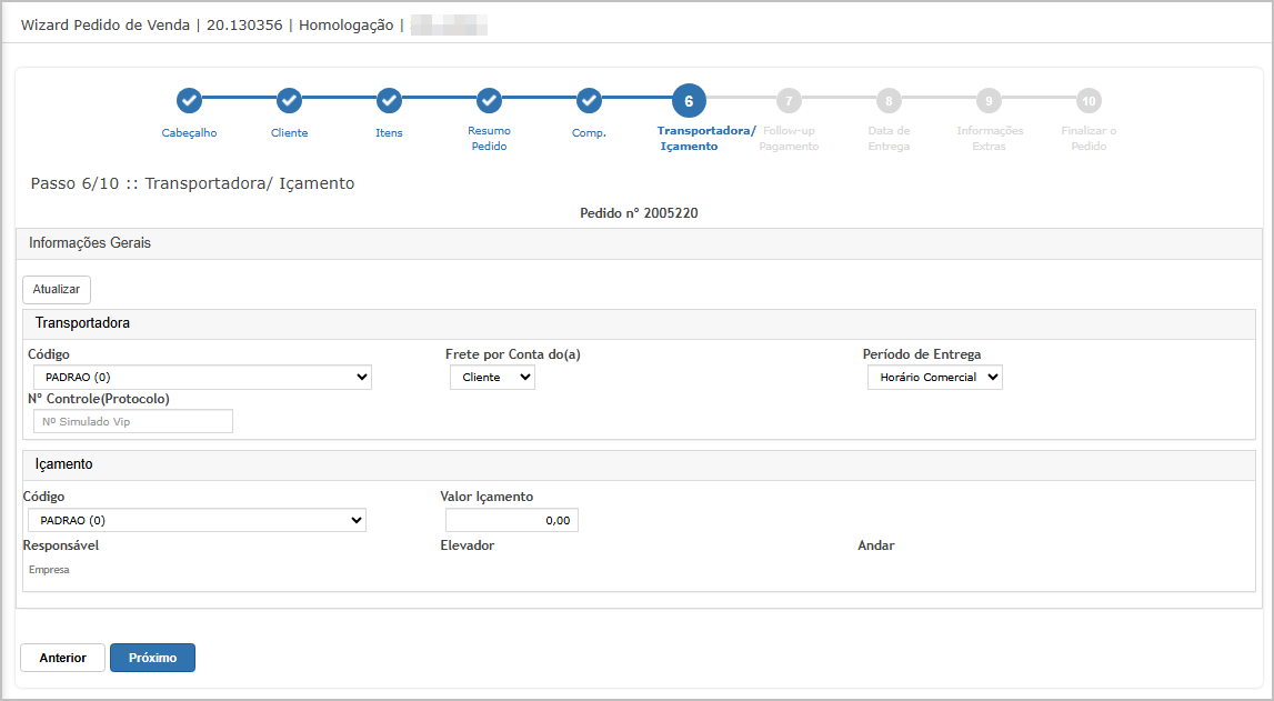 Step 6 - Transportadora / Içamento - Verifique os dados.