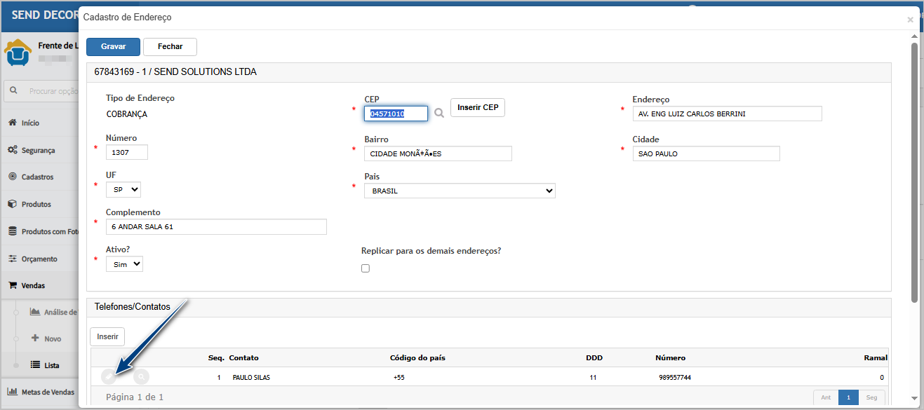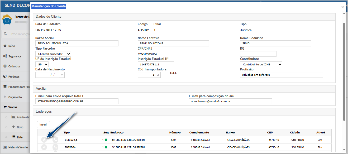 No cadastro do cliente, clique em editar o endereço desejado.