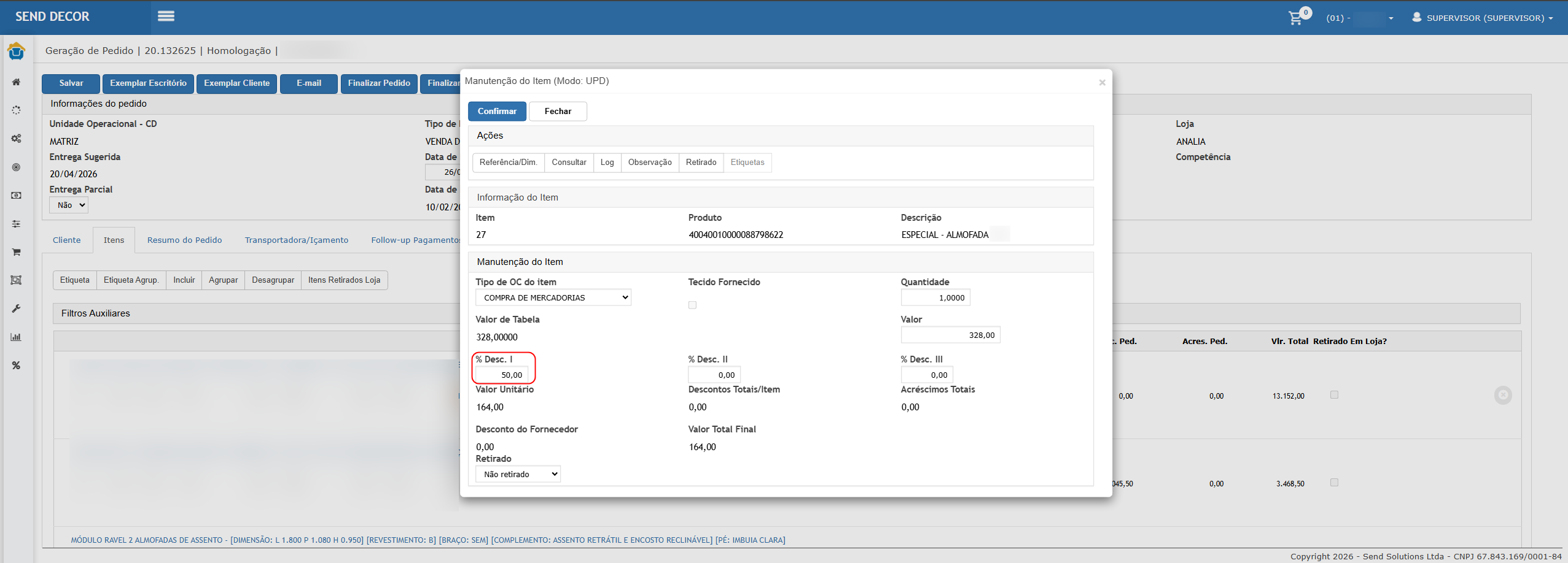 Manter o desconto aplicado no item (Desc. 1 = 50%).
