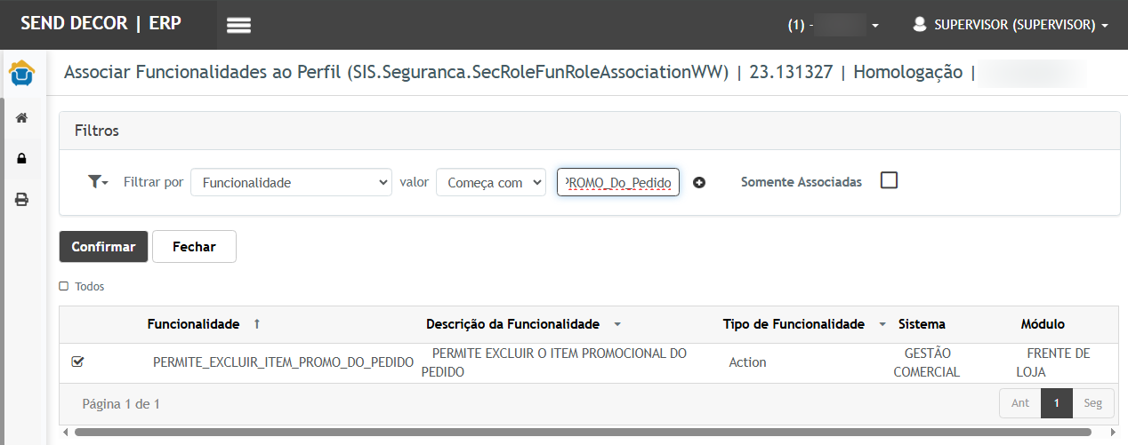 Habilitar funcionalidade no perfil Menu: Corporativo > Segurança > Perfil > Funcionalidades