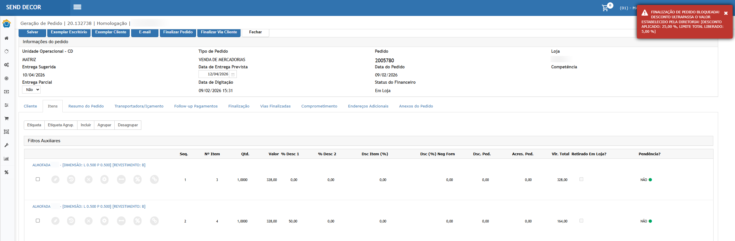 Validar que o sistema bloqueia a finalização do pedido quando o desconto aplicado ultrapassa o limite permitido pela condição de pagamento/diretoria.