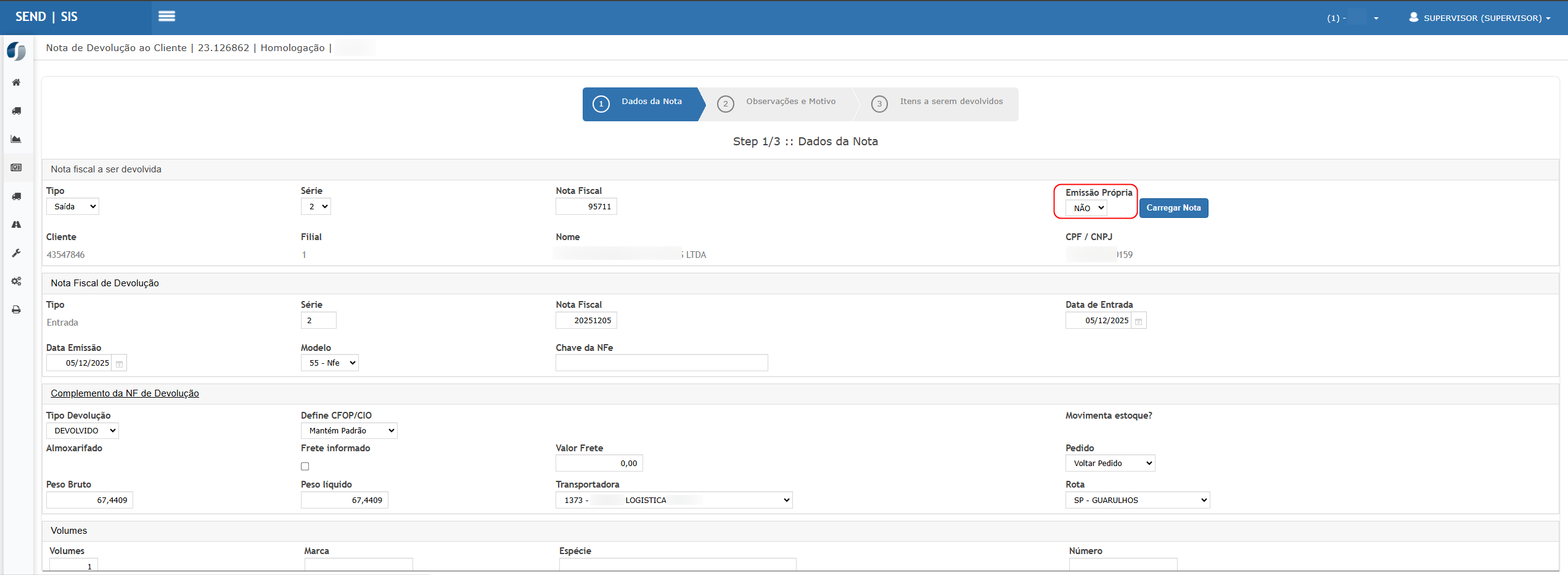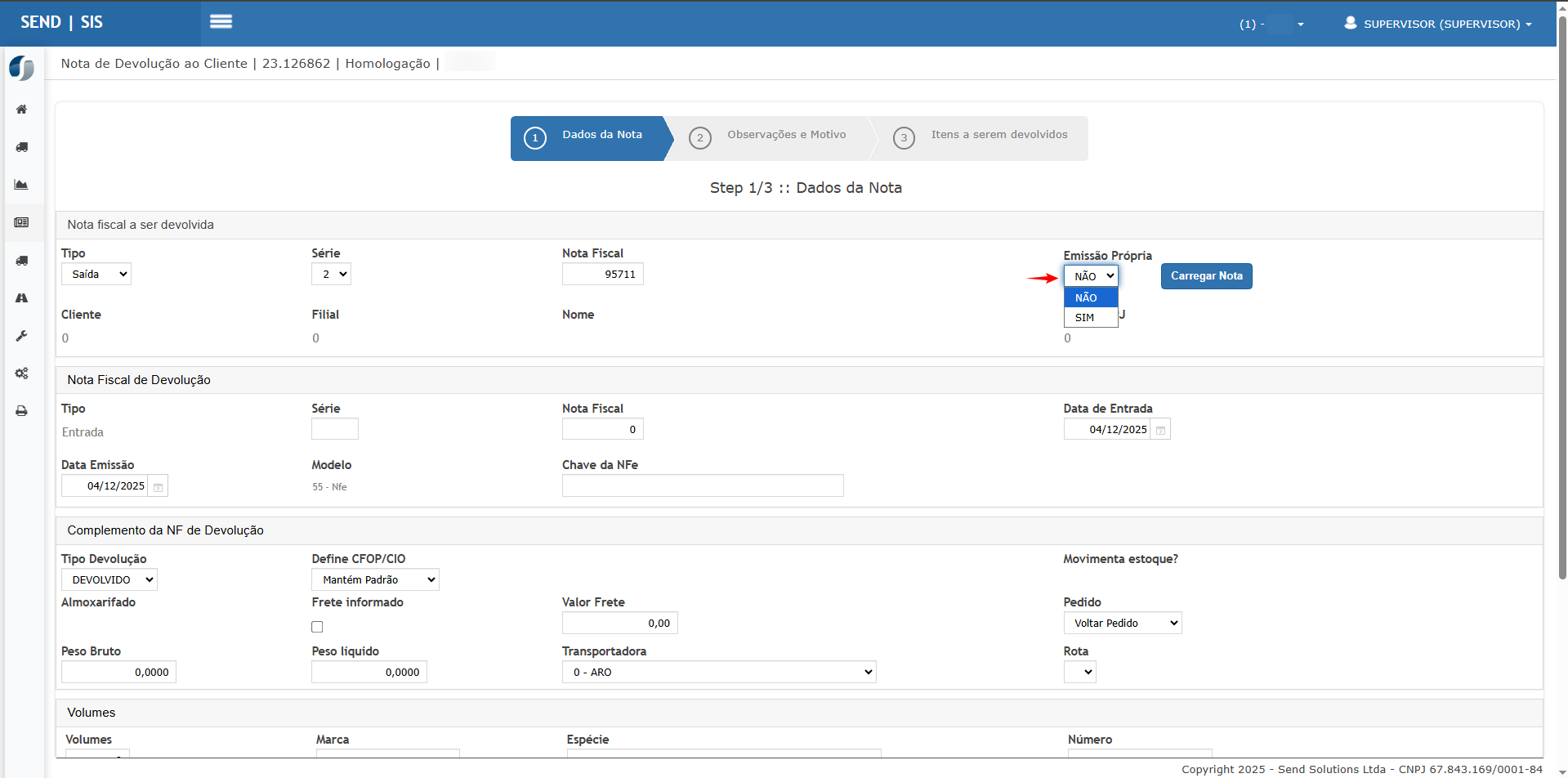Cenário 2 – Geração de nota de devolução com Emissão Própria = SIM