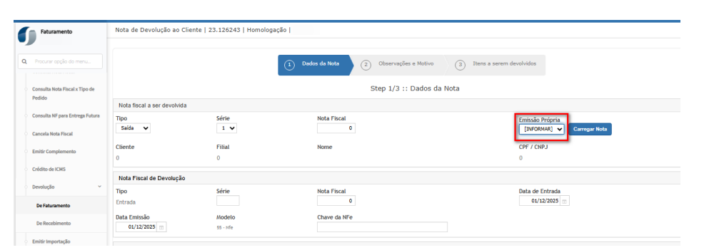 Esta solicitação tem por objetivo, garantir que o campo “Emissão Própria” da Nota Fiscal de Devolução de Faturamento, garantindo que: