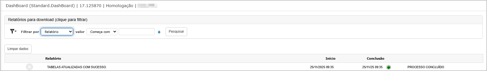 • Utilize o Dashboard para consultar o status do processamento, horários de início e conclusão e a situação final da atualização.
