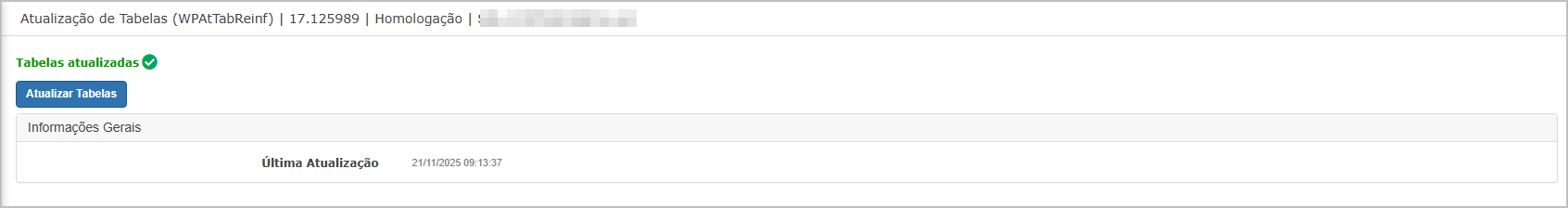 Na tela principal, o sistema exibe as informações sobre a última atualização realizada e o status atual das tabelas fiscais.