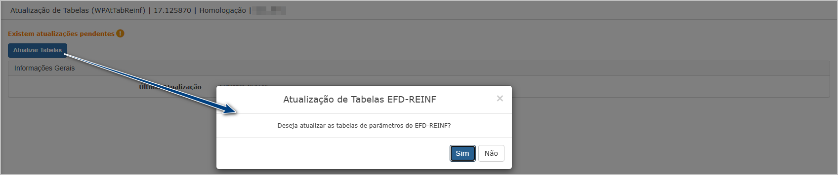 • Para atualizar as tabelas fiscais, clique em Atualizar Tabelas e confirme a ação no pop-up exibido.