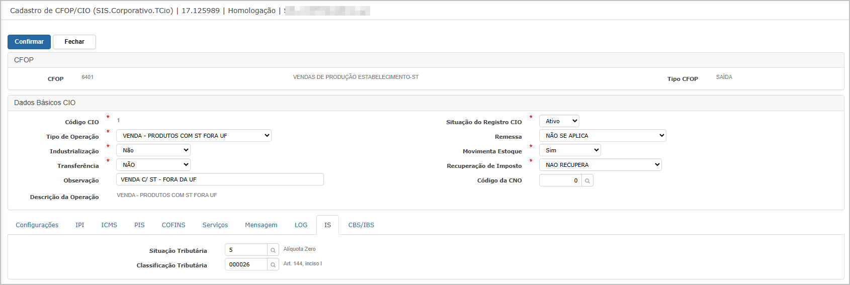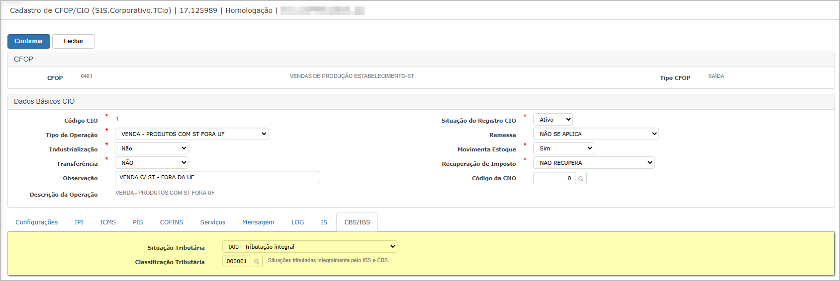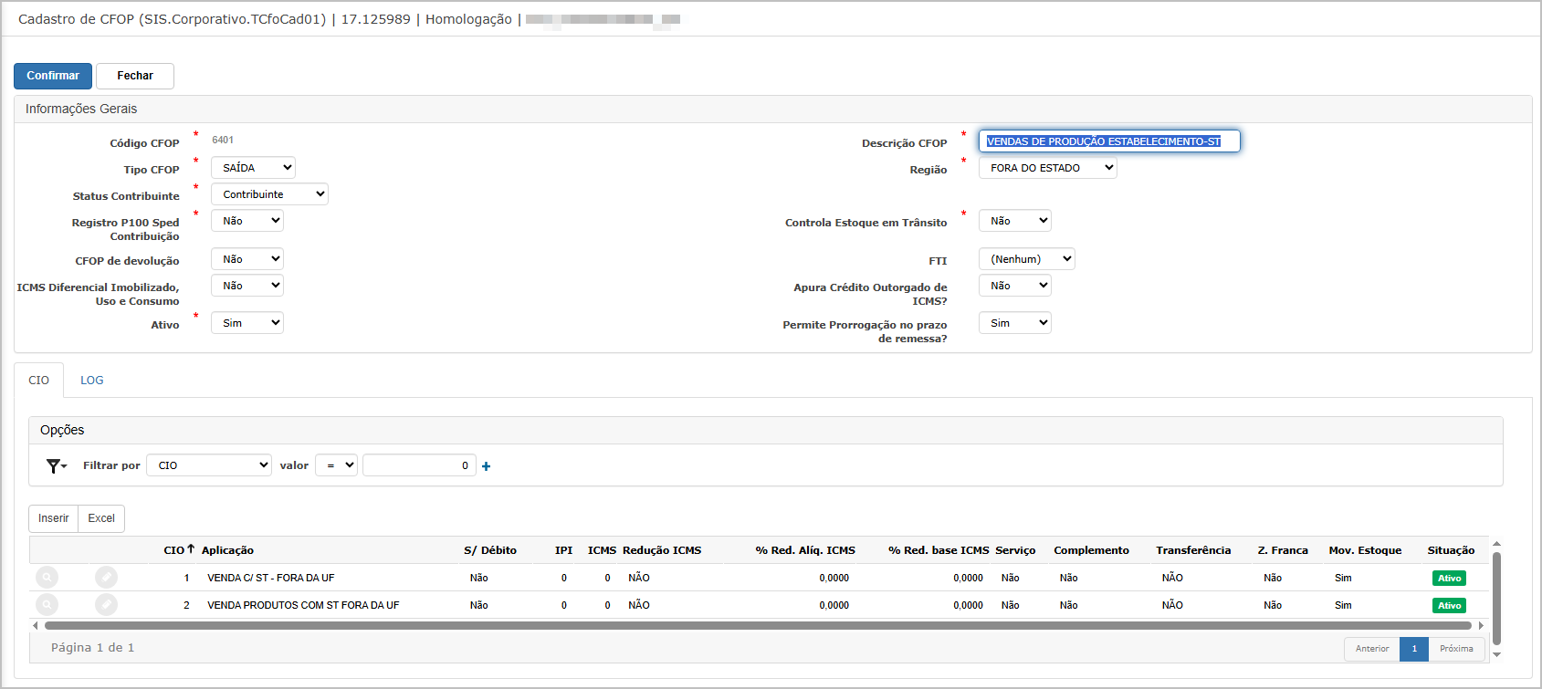 A aba CIO permite cadastrar operações específicas vinculadas ao CFOP.