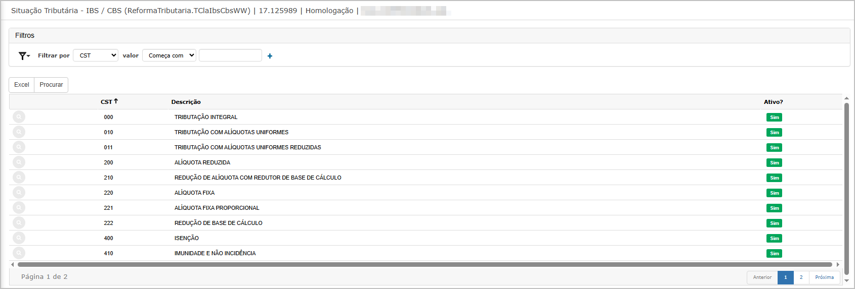 • Utilize os filtros da tela principal para pesquisar rapidamente pelos códigos de CST ou descrições.