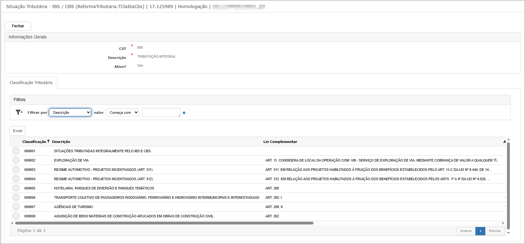 • Os dados apresentados são atualizados pela rotina de Atualização de Tabelas Básicas Fiscais, mantendo o sistema alinhado à legislação da Reforma Tributária.