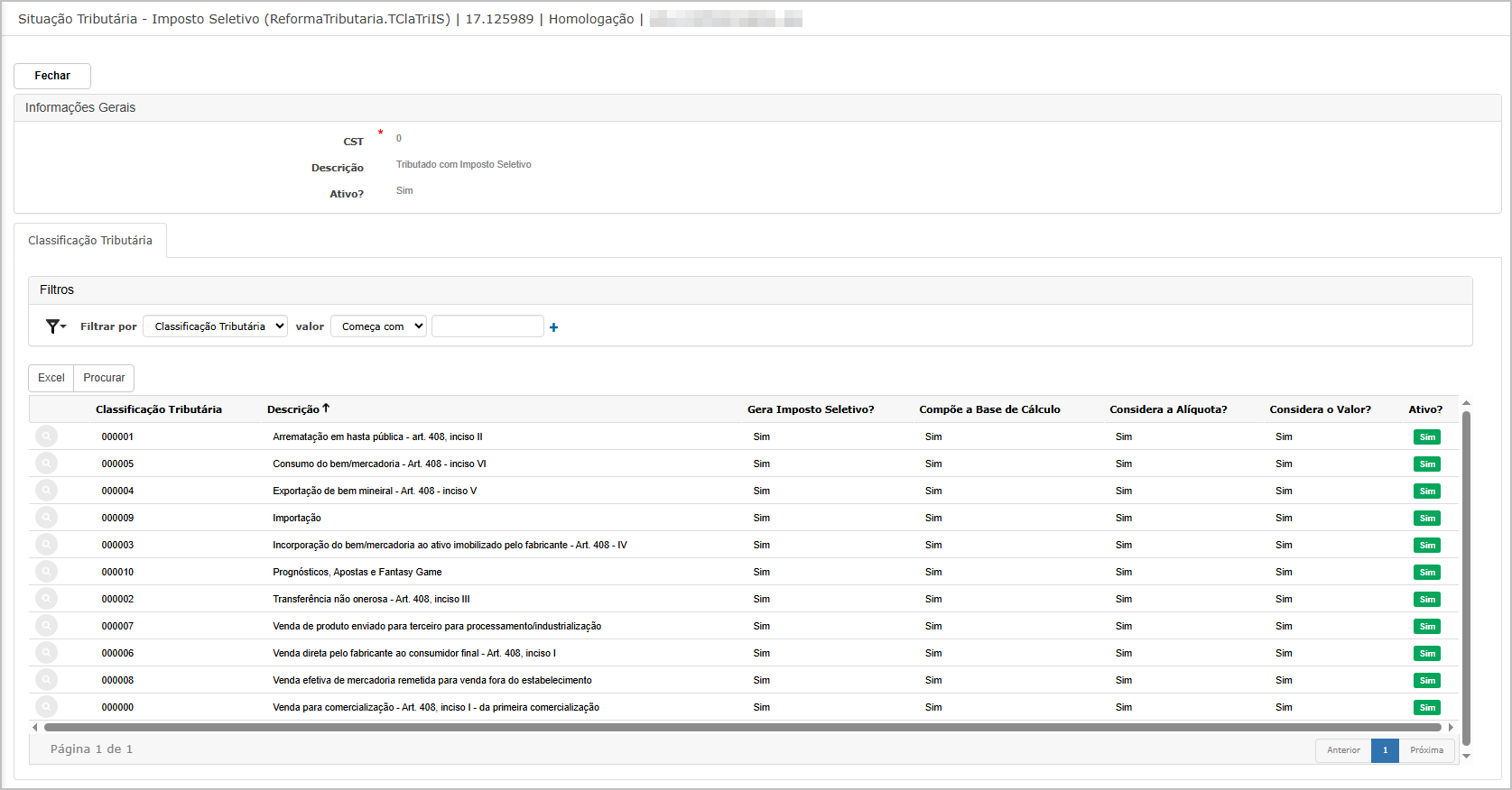 Nessa tela, o usuário pode consultar os códigos de CST do IS, visualizar todas as classificações fiscais vinculadas e acessar os detalhes completos de cada classificação, atualizadas automaticamente pela rotina de Atualização de Tabelas Básicas Fiscais.