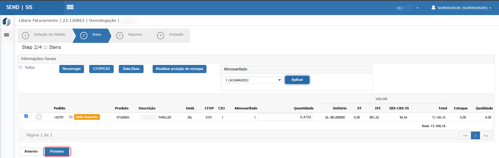 No Step 2/4: Itens, o sistema apresenta os produtos pertencentes ao pedido.