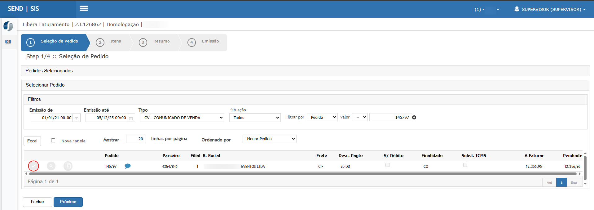 Apenas pedidos aptos ao faturamento estarão habilitados para seleção.