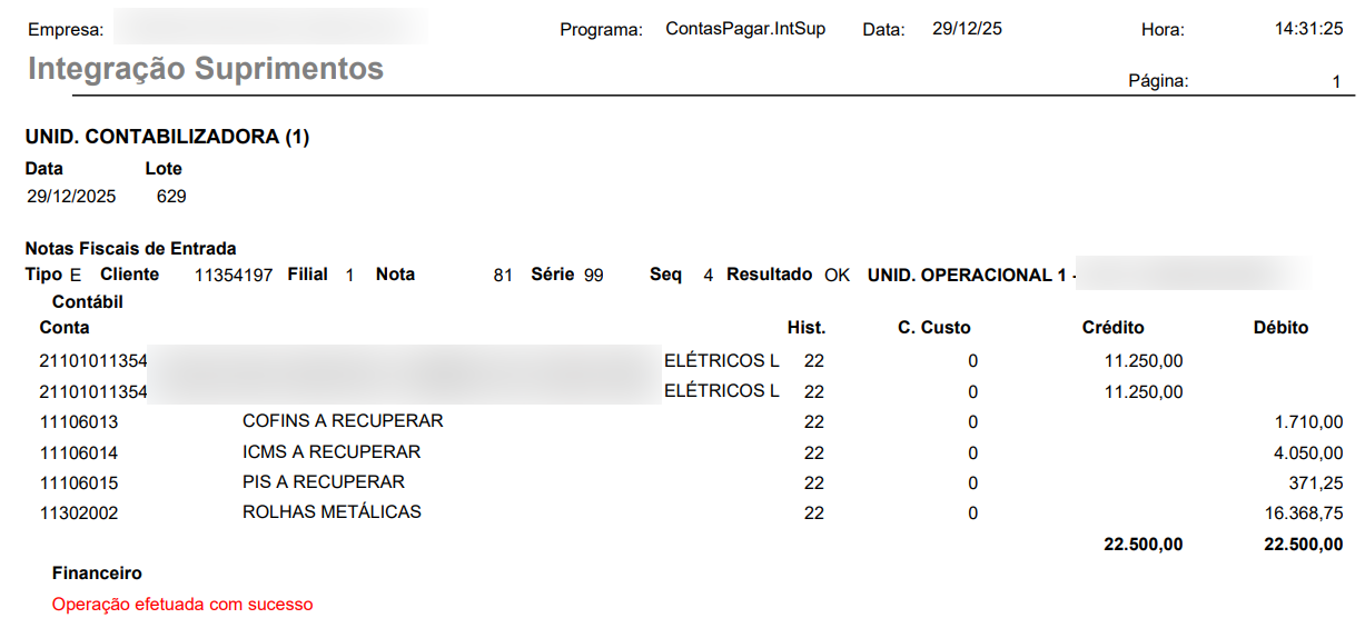 A rotina de Integração de Suprimentos no módulo Contas a Pagar é responsável por integrar as notas fiscais de entrada já recebidas no sistema (via XML, manifesto ou lançamento manual) com o financeiro e a contabilidade.