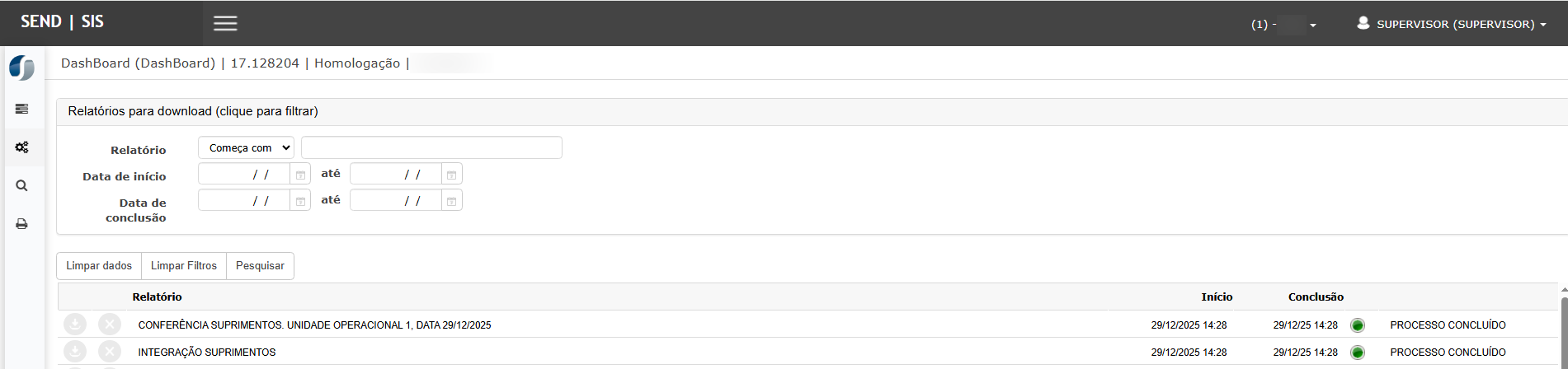 O relatório Integração Suprimentos apresenta o detalhamento completo da integração realizada.